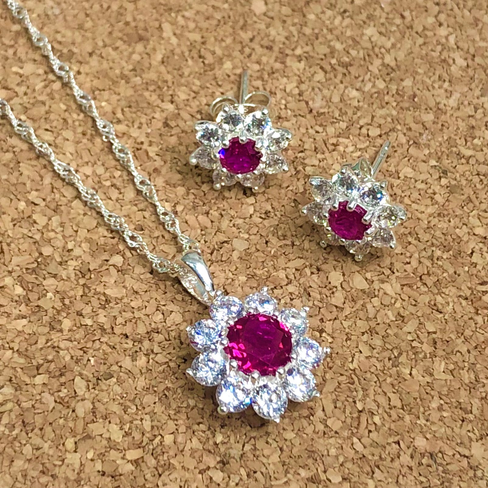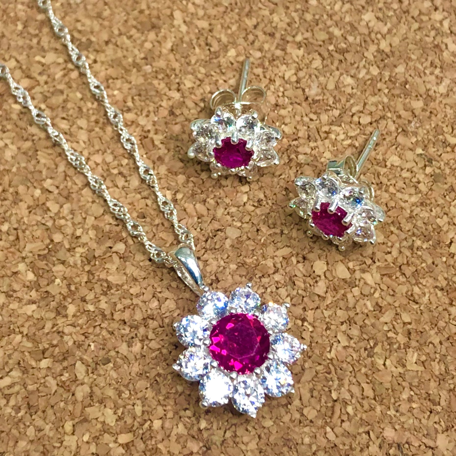 Sterling Silver Halo Solitaire?Created Ruby & CZ Pendant and Earring Set