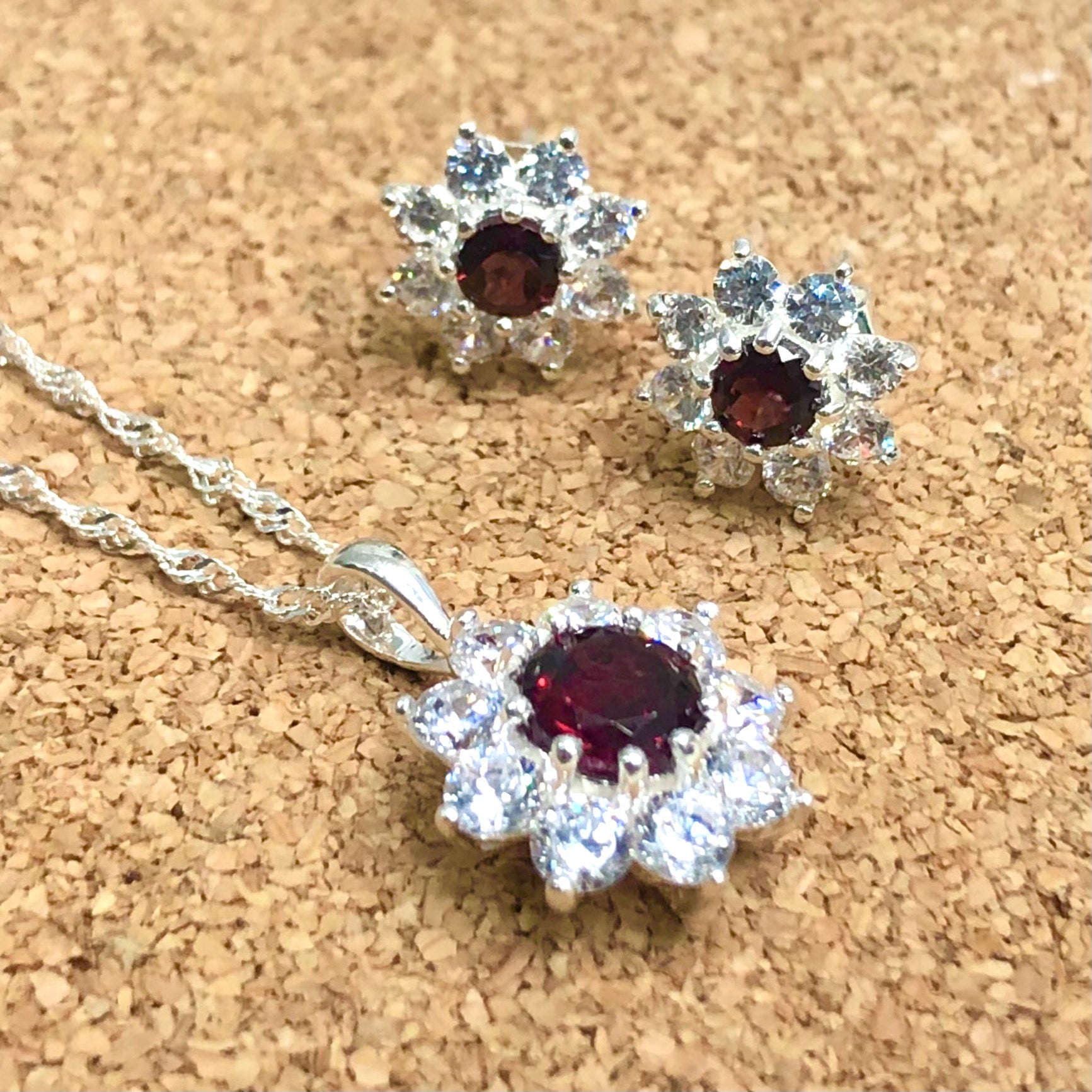 Sterling Silver Halo Solitaire?Created Ruby & CZ Pendant and Earring Set