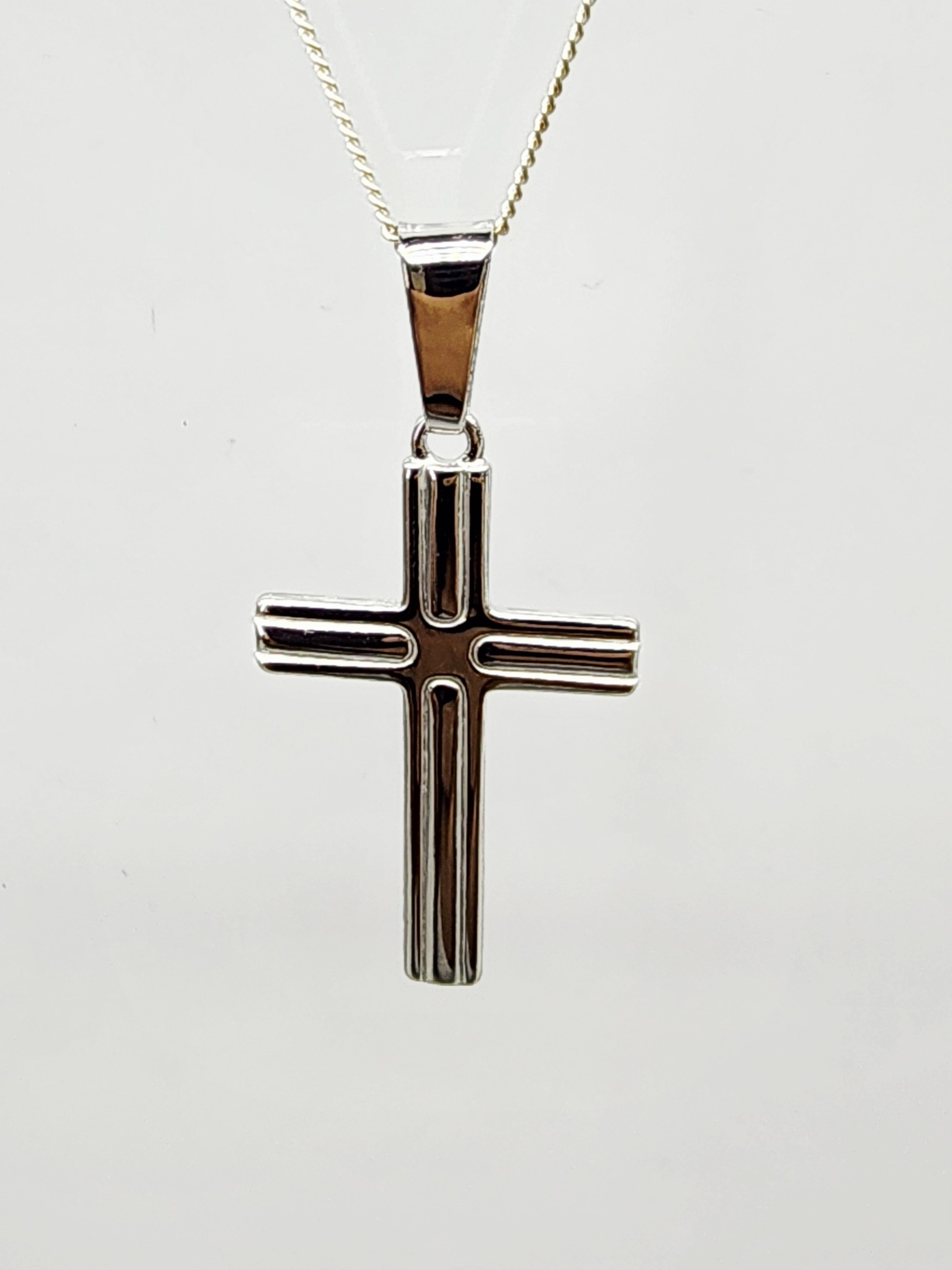 Crafted from solid sterling silver, this beautifully designed cross pendant features a sleek high-polished finish with a subtle double-line detail through the centre, giving it a refined and elegant look. Measuring 20mm wide by 43mm high including the bale, this pendant is paired with a complimentary sterling silver chain, making it a perfect symbol of faith and style — ideal for both everyday wear and special occasions.