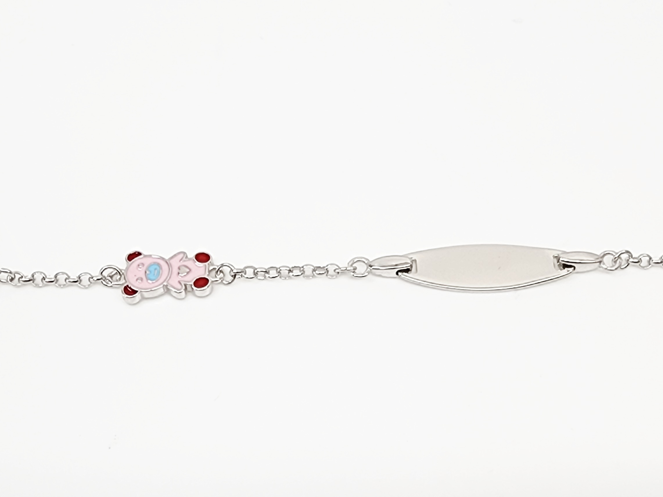 This charming children’s ID bracelet is crafted from premium 925 sterling silver and designed with a playful teddy bear charm. The teddy bear sits beautifully between delicate belcher links, adding a touch of fun and character. The charm is decorated with colourful enamel accents in pink, red, and blue, giving it a cheerful and eye-catching finish.