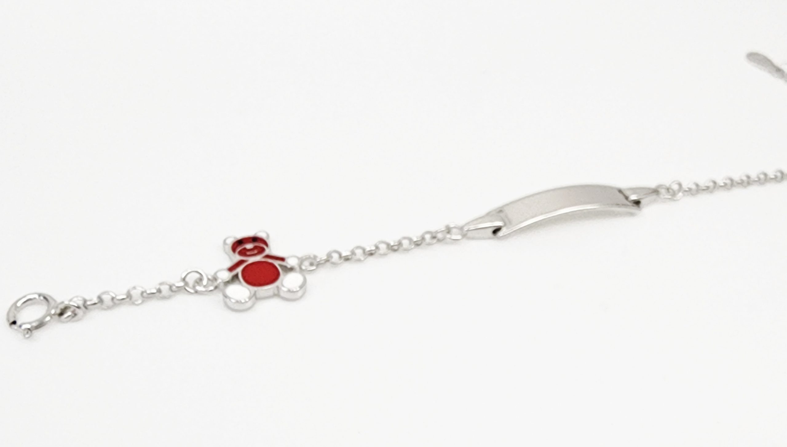 This charming children’s ID bracelet is beautifully crafted in genuine 925 sterling silver, making it both durable and safe for everyday wear. The bracelet features a playful teddy bear charm, seamlessly set between the delicate belcher-style links. The teddy bear is adorned with a red and white enamel finish, giving it a bright, cheerful character that kids will love.