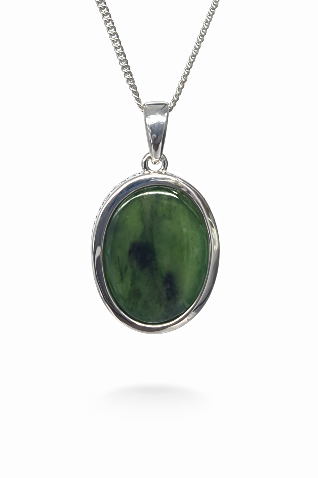 Celebrate the beauty of New Zealand greenstone (pounamu) with this elegant sterling silver oval pendant, beautifully designed with traditional inspiration and refined craftsmanship.