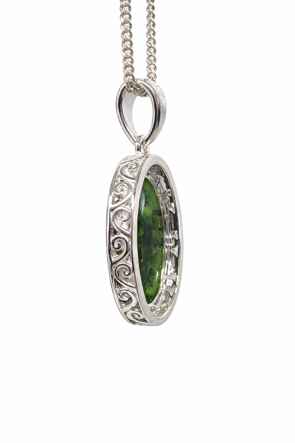 Sterling Silver Oval New Zealand Greenstone Pendant with Filigree Koru Edge 16mm x 21mm – SSRDZ
