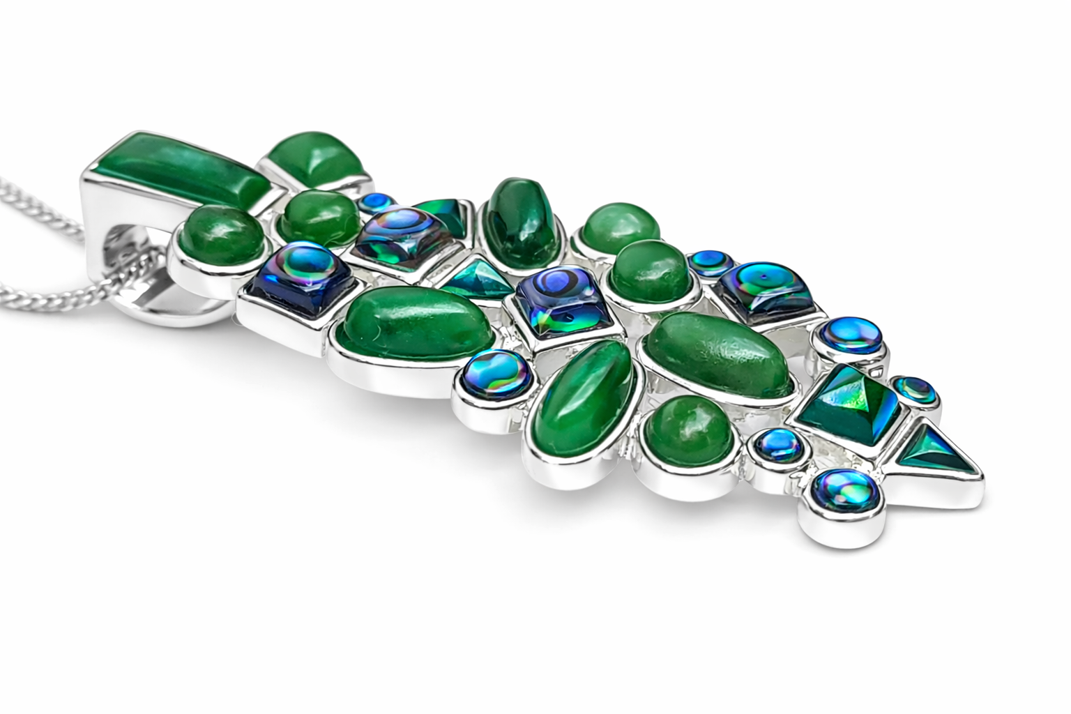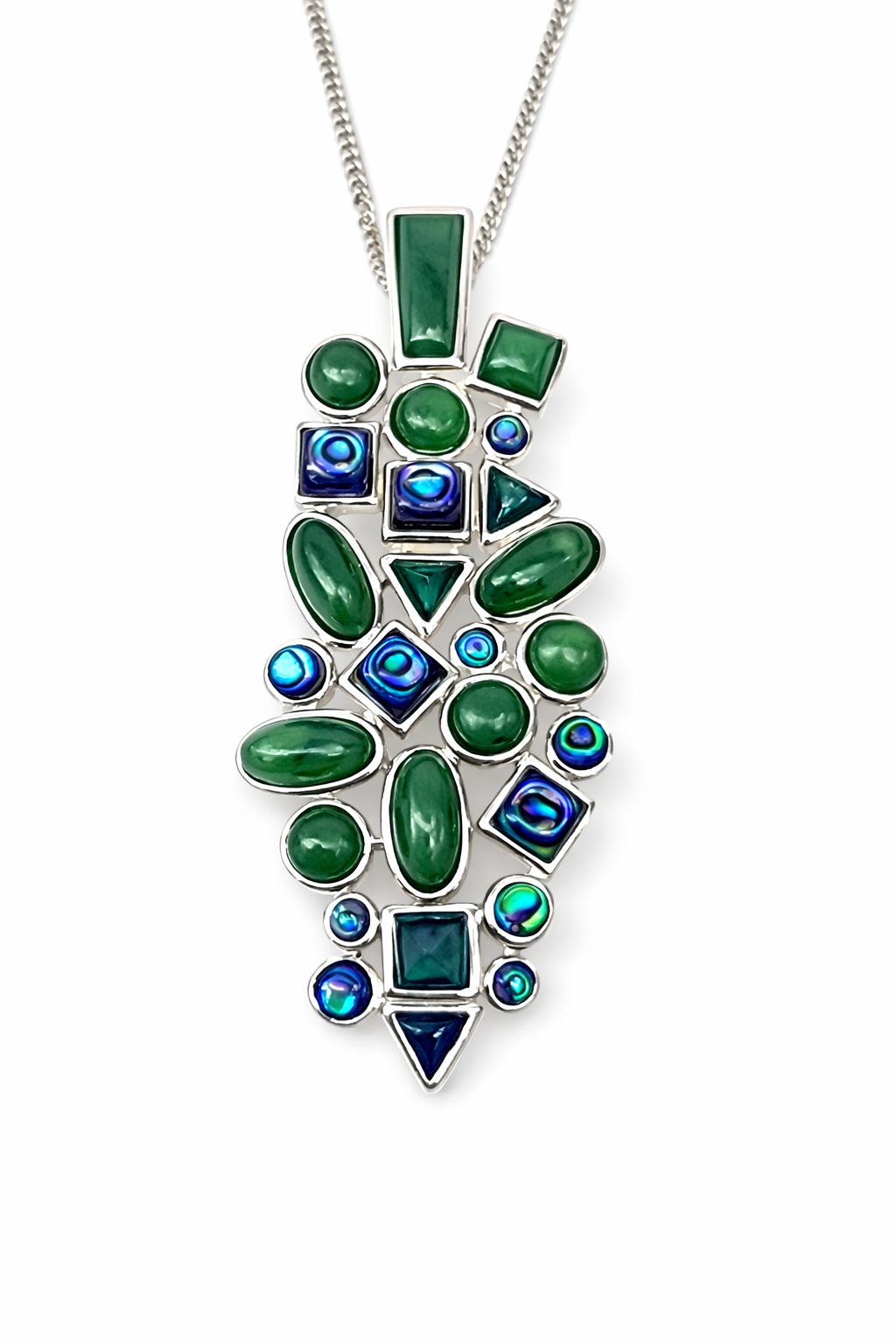 This contemporary statement piece showcases a stunning arrangement of natural greenstone cabochons paired with vibrant paua shell inlays, creating a beautiful contrast of rich green tones and iridescent ocean blues. Each stone is individually secured in a smooth rubover (bezel) setting, enhancing durability while giving the pendant a clean, modern finish.