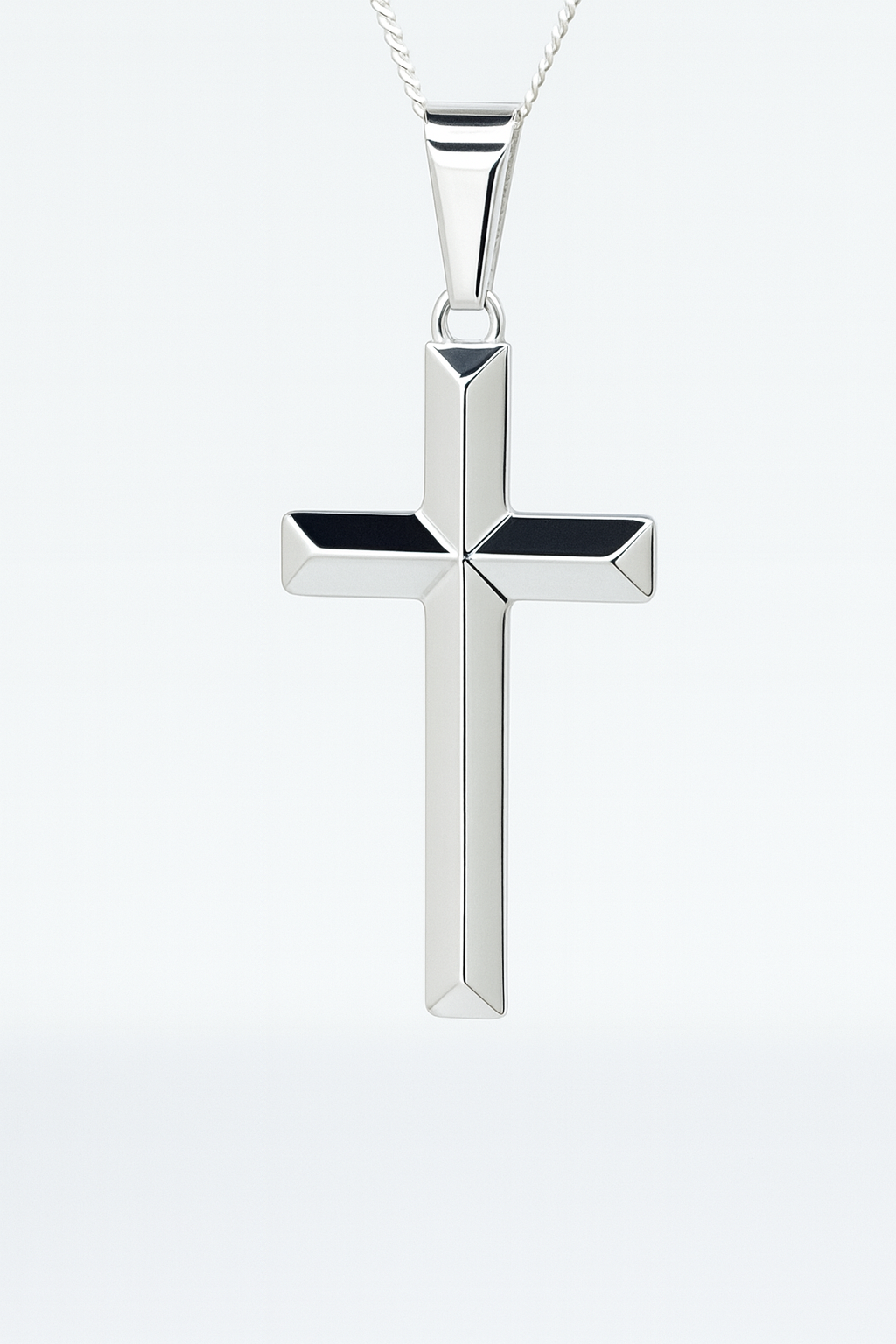 Crafted from premium sterling silver, this sleek cross pendant features a clean, modern design with precise beveled edges and a brilliant high-polished finish. Its refined simplicity makes it perfect for both daily wear and special occasions. Measuring 20mm wide by 42mm high including the bale, it comes complete with a complimentary sterling silver chain — a timeless symbol of faith and elegance.