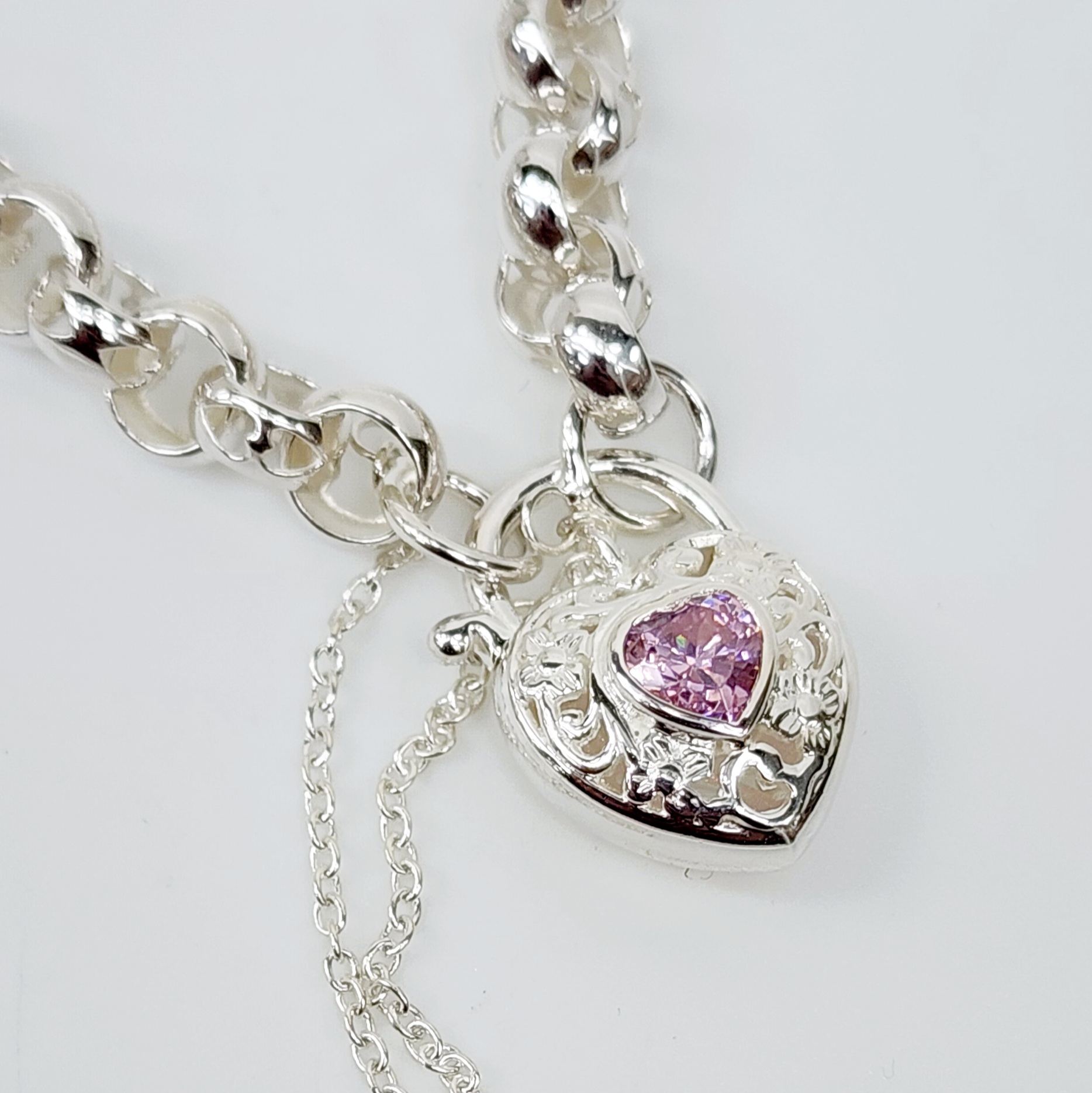 Sterling Silver Round Belcher with Heart Shape Pink CZ Filigree Padlock Bracelet