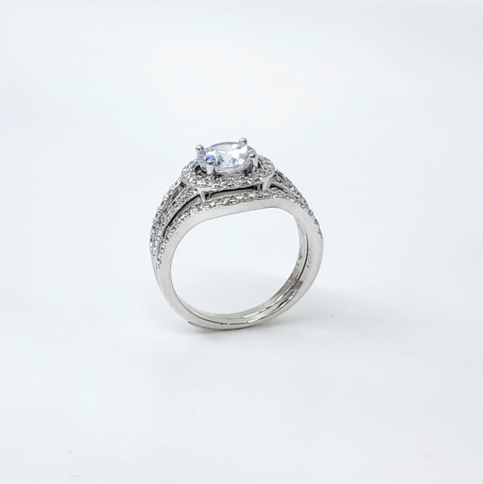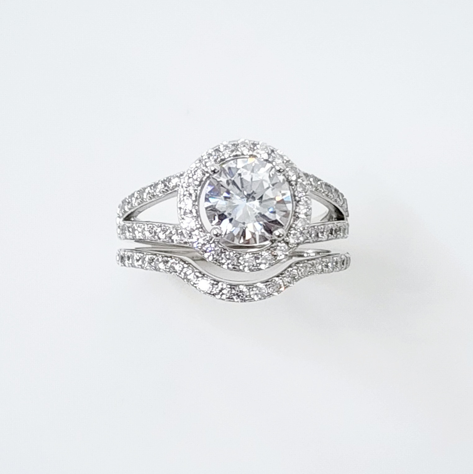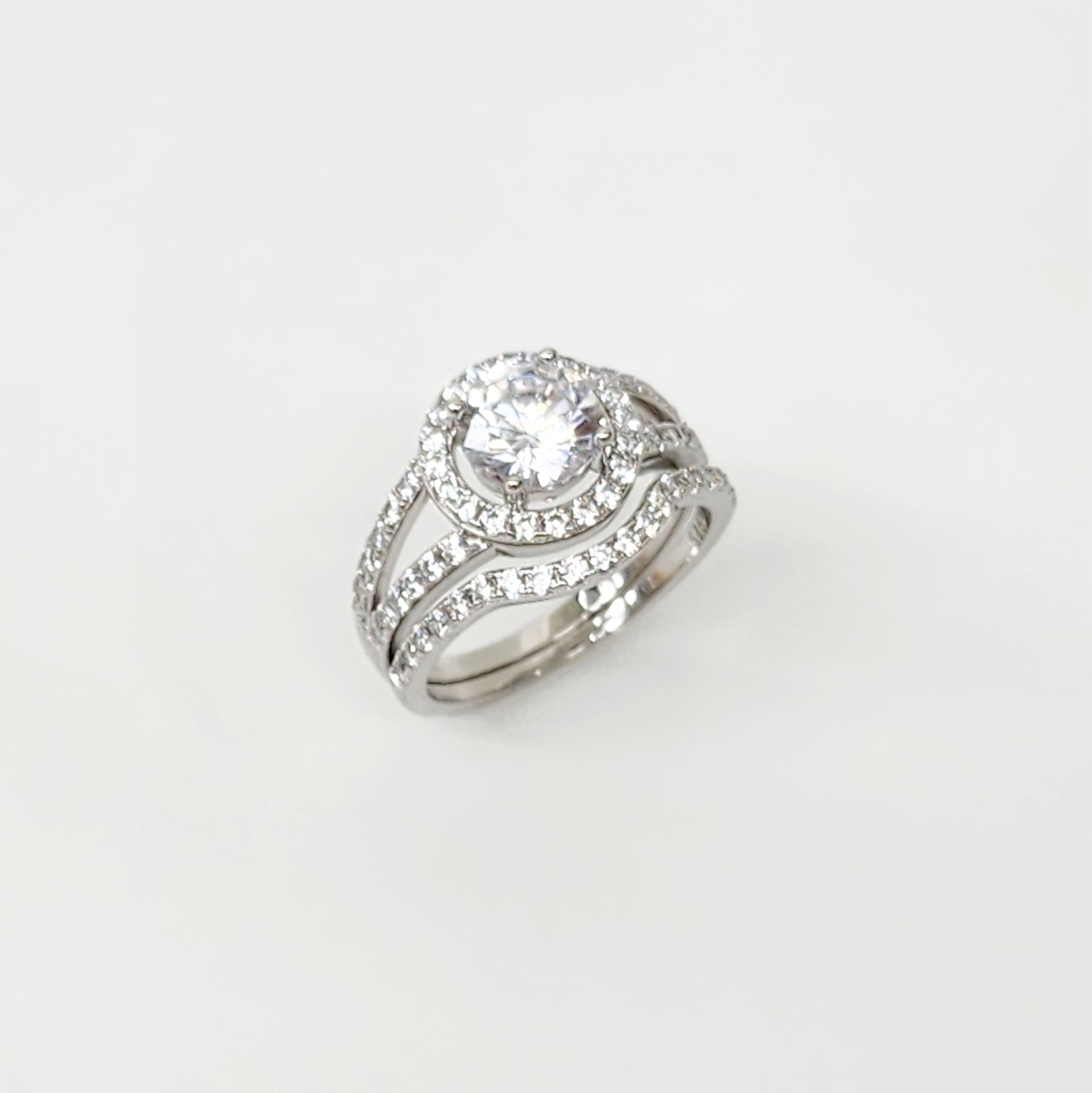 Sterling Silver Round Cut Halo Engagement Ring with Split Shank & Matching Wedding Band with CZ Setting