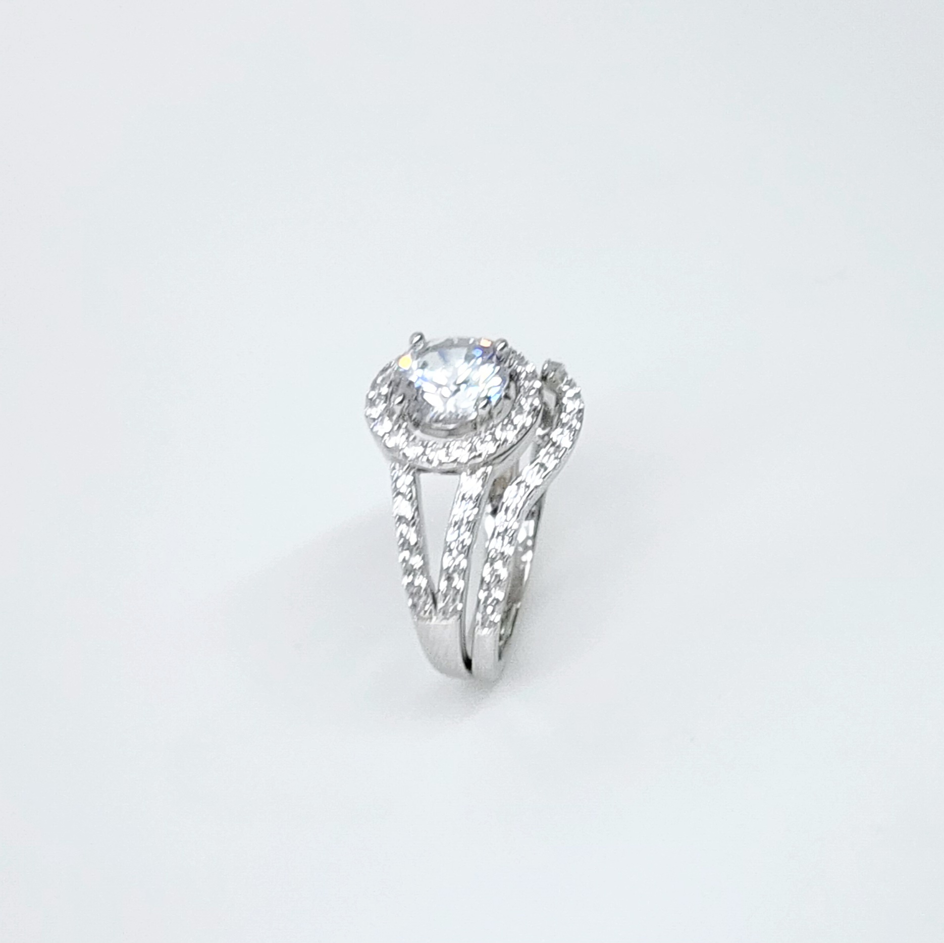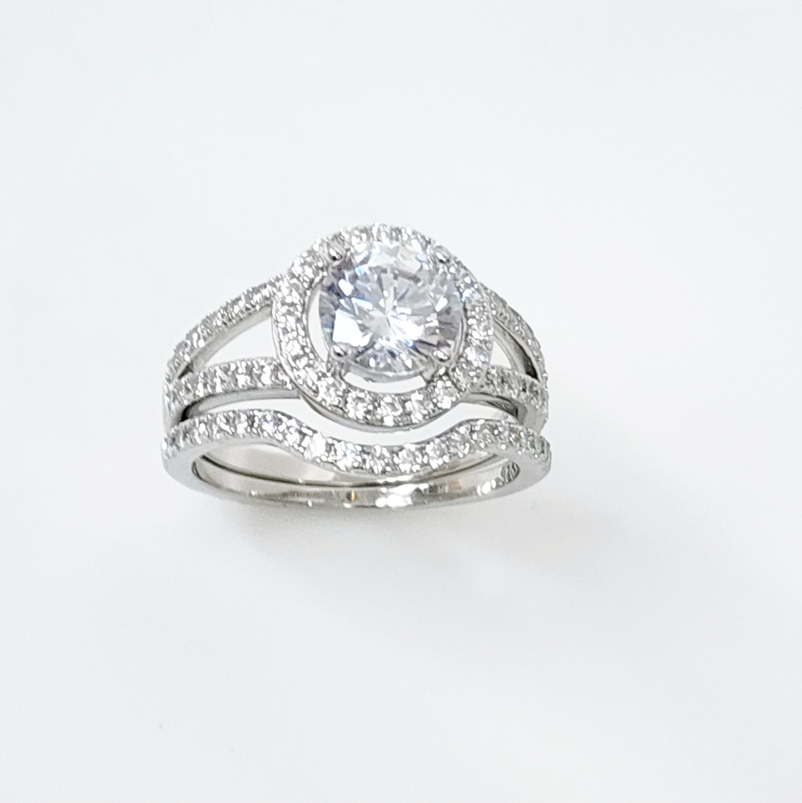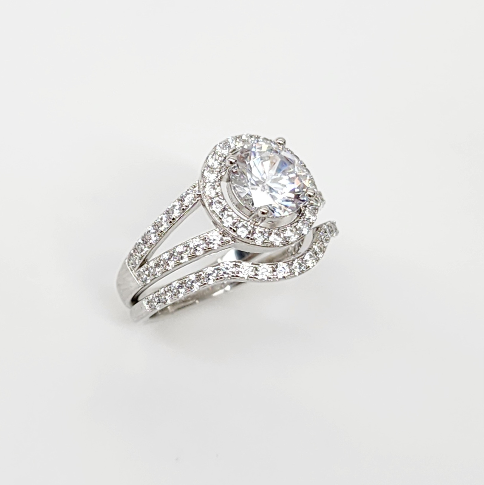 Sterling Silver Round Cut Halo Engagement Ring with Split Shank & Matching Wedding Band with CZ Setting