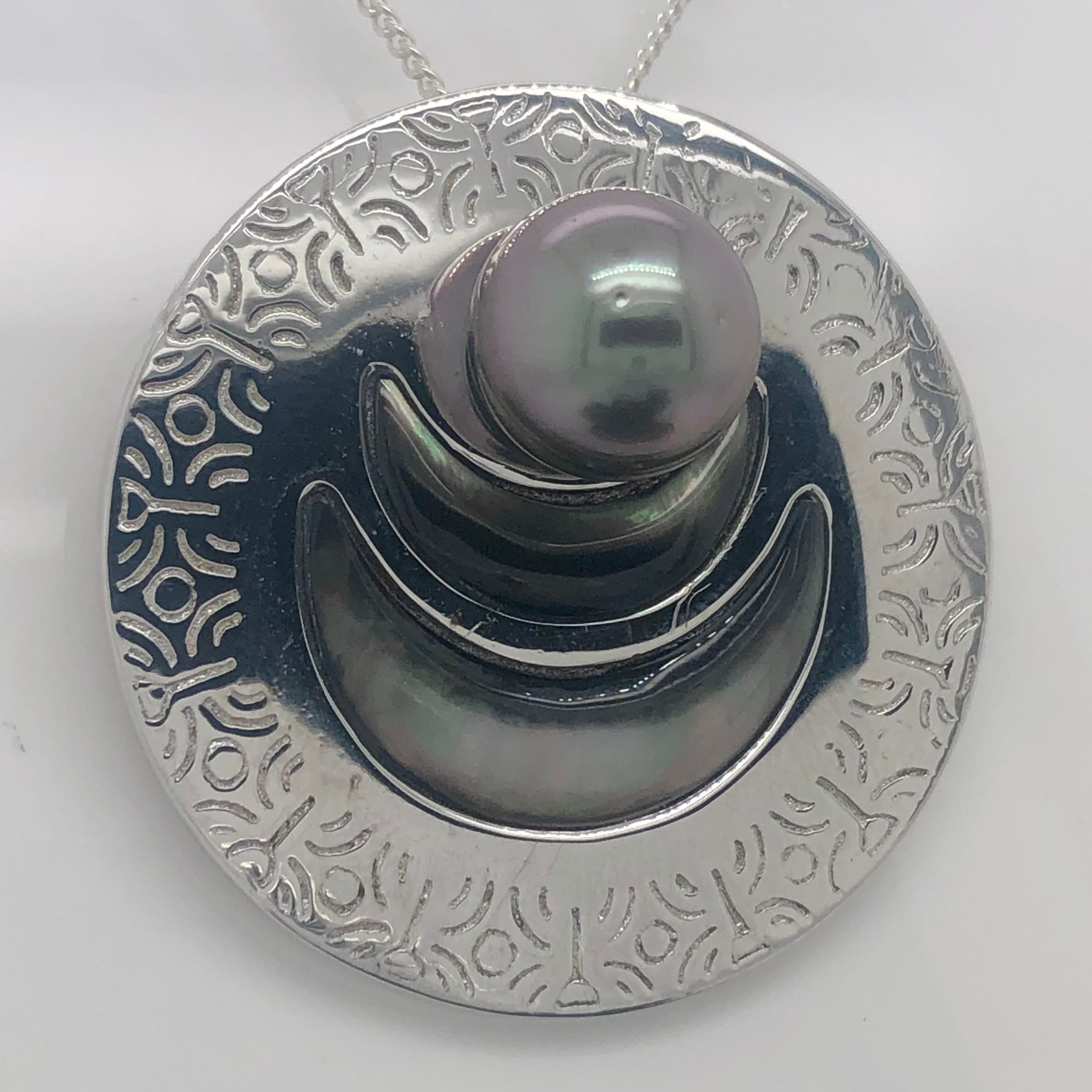 Sterling Silver Round Engraved Tahitian Design with 11mm-12mm Tahitian Black Pearl and Dark Mother Of Pearl Shell Inlay