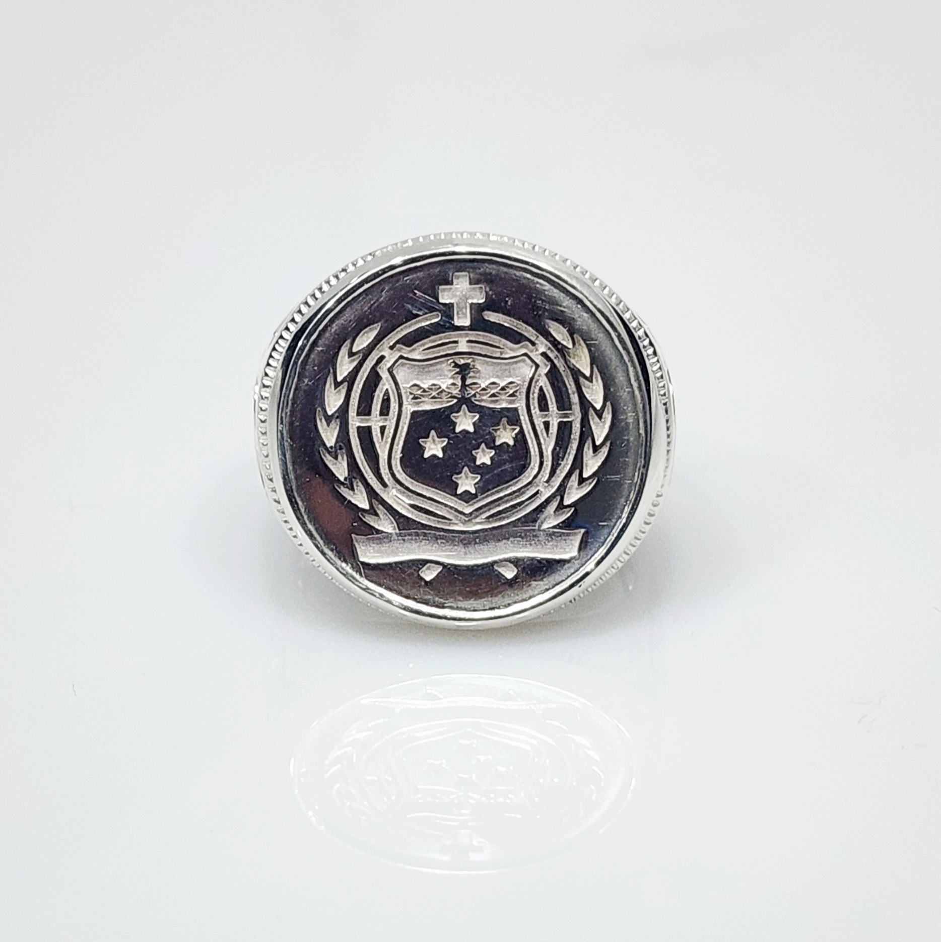 Sterling Silver Samoan Sila Coin Ring with Filigree Ring Mount