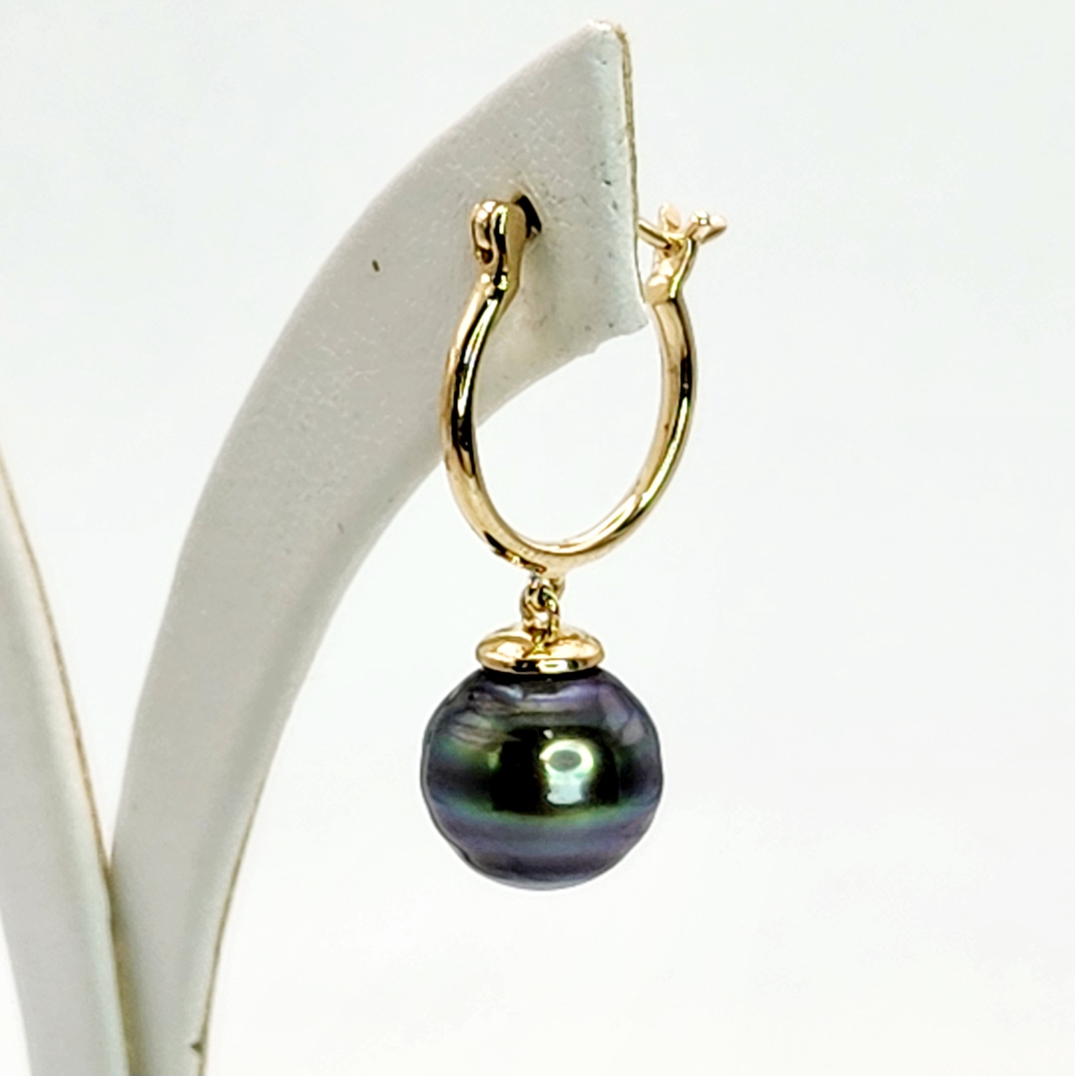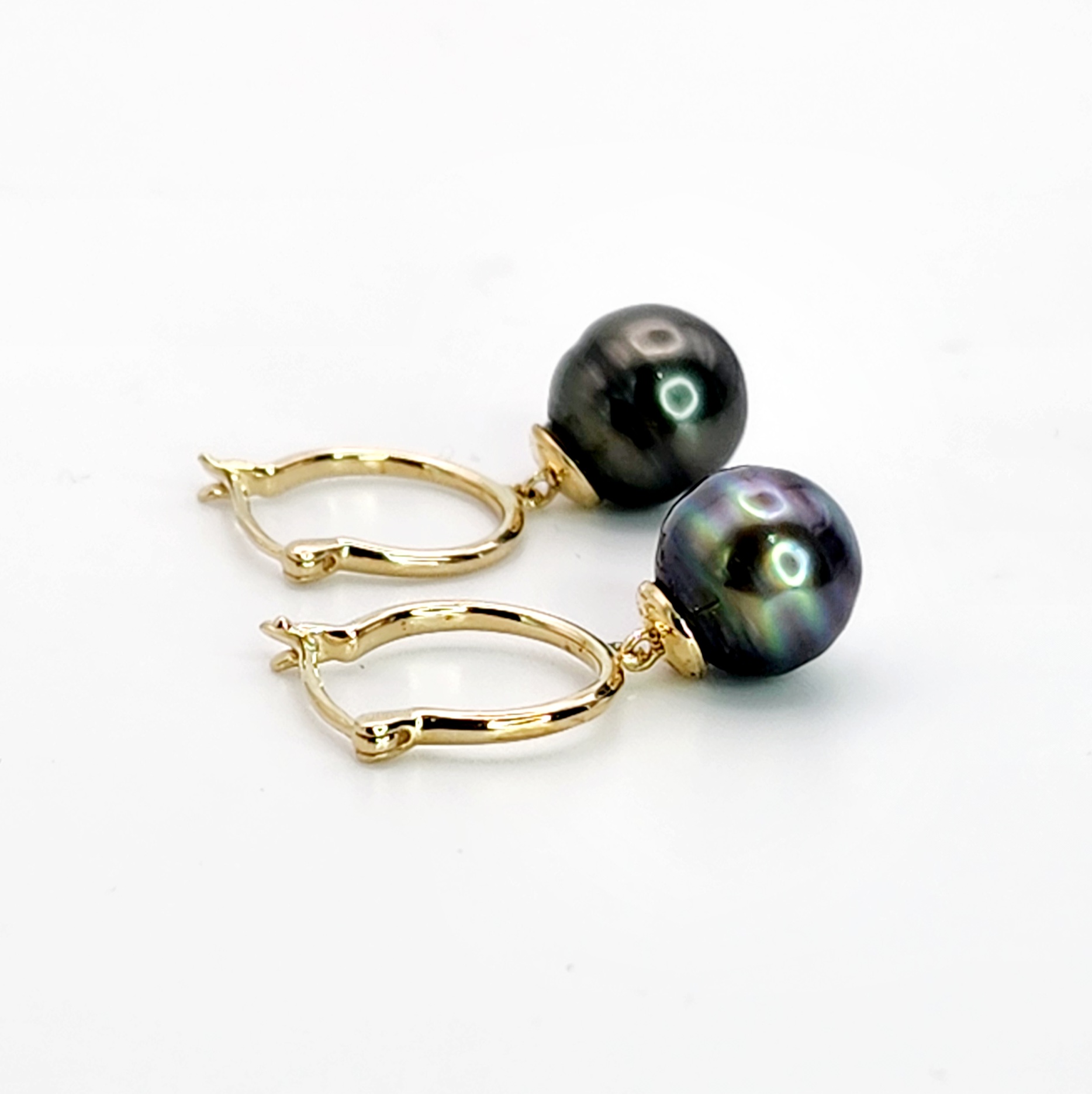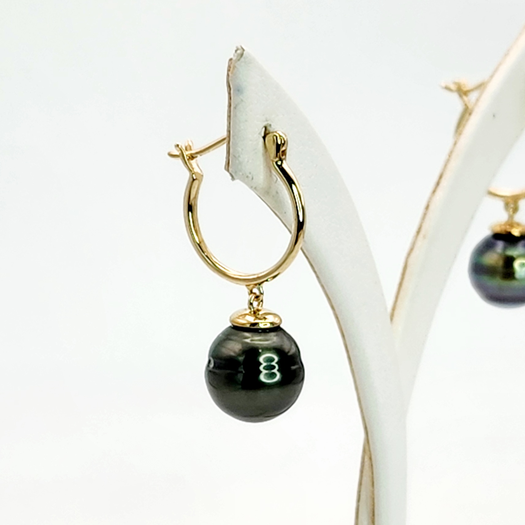 9ct Yellow Gold 9-10mm Round Tahitian Black Pearl Hoop Earrings
