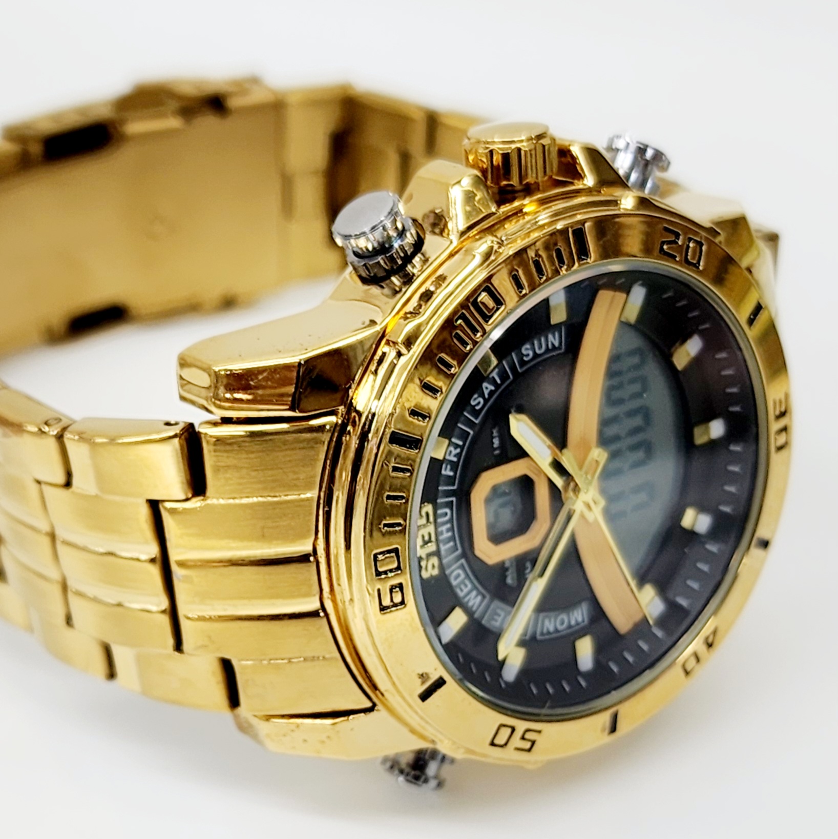 Stylish Dual Time Mens Analog/Digital Metal Strap, Multifunction LED Analog Gold Tone Band, Black Dial Quartz Watch