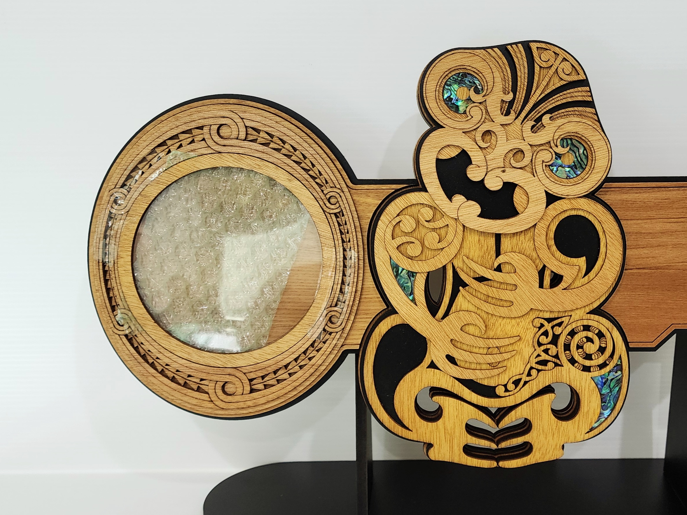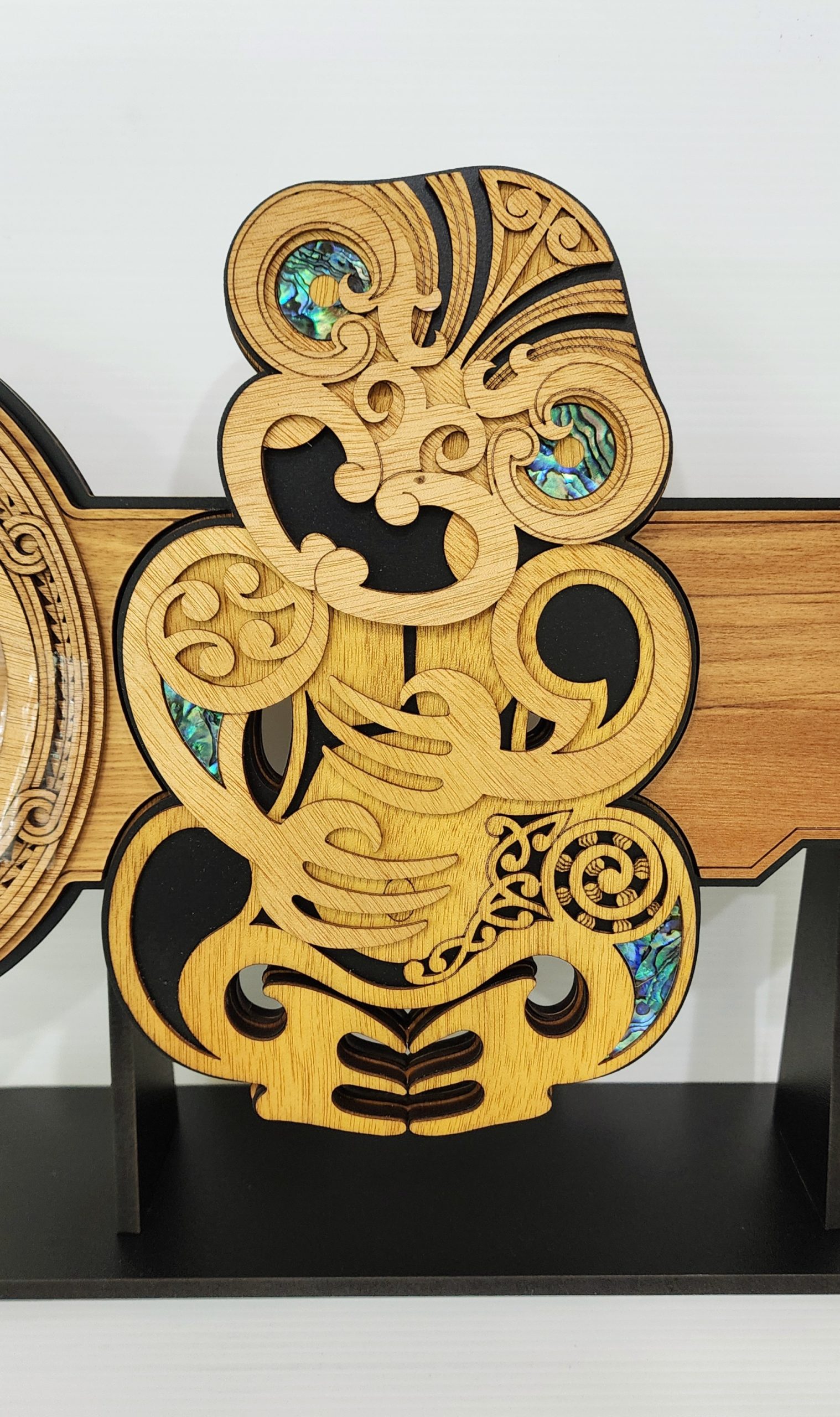 This artwork with its intricate design is an impressive contemporary representation of Hei-Tiki.?The key is crafted from recycled Native New Zealand Rimu veneerboard, medium density fibreboard (mdf), Gaboon veneer plywood and embellished with NZ Paua &?Mother of Pearl?laminate.