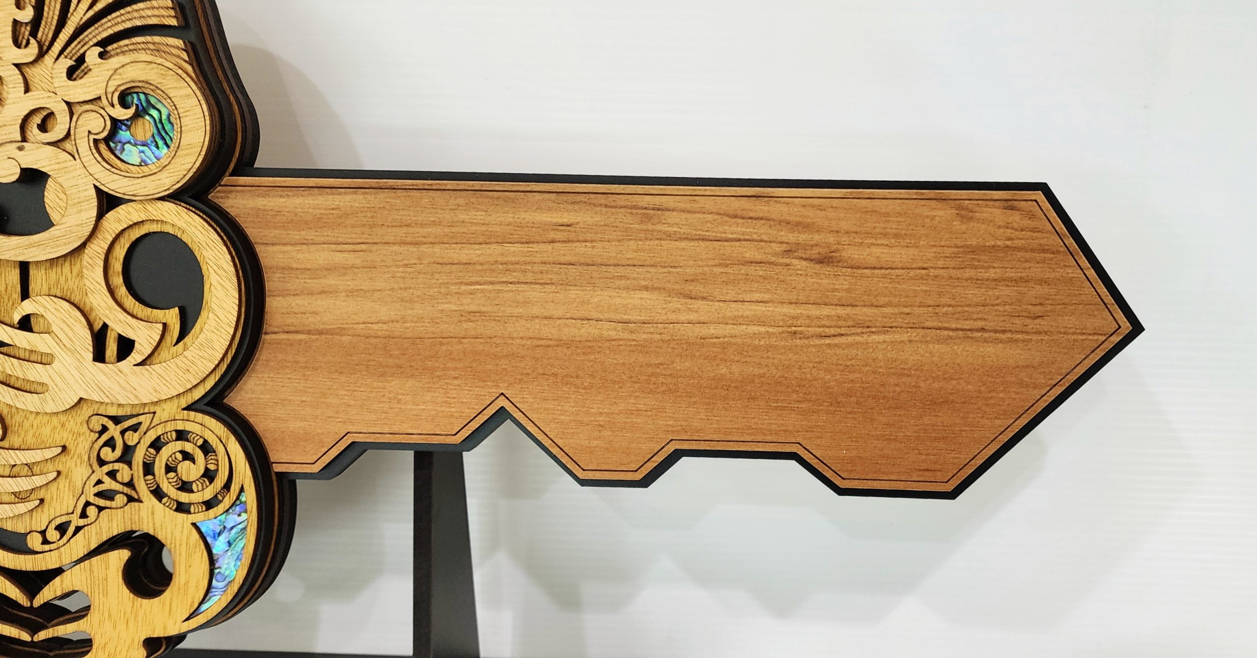 The key is crafted from recycled Native New Zealand Rimu veneerboard, medium density fibreboard (mdf), Gaboon veneer plywood and embellished with NZ Paua shell.