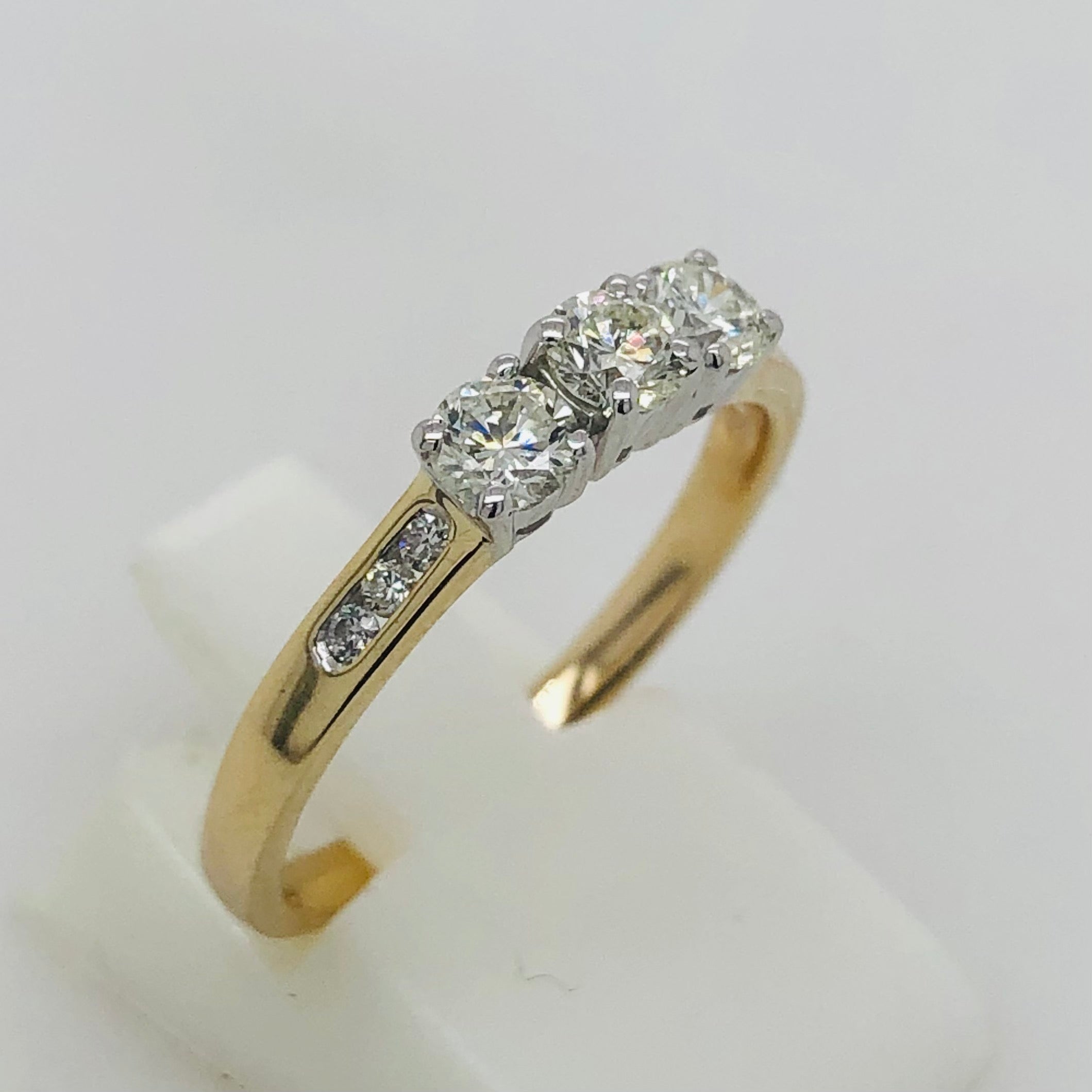 The 9ct gold band is channel set with diamonds on the shoulders, leading to the three round brilliant diamonds at its centre set in 9ct gold.
