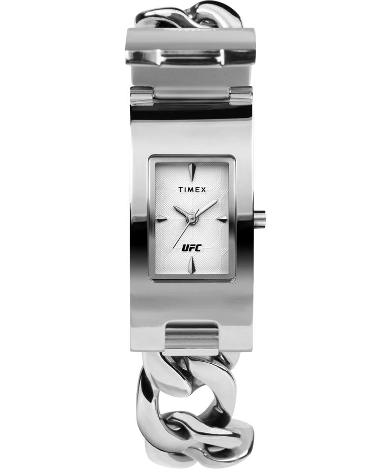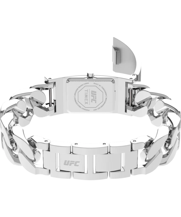 Every fight fan knows that the ultimate award is the UFC championship belt. Designed to represent the greatest honor in combat sports, the TIMEX UFC Championship Bracelet ID pays its respect to UFC?s authentic history while showing off the flashier side of timekeeping. A stainless-steel case houses the analog three-hand movement, which we?ve carefully concealed under a sleek silver-tone cover adorned by a UFC crystal logo fill. The jewelry-inspired chain bracelet can be sized to most wrists thanks to the removable links, with the promise that?from in and out of the Octagon?this piece is sure to get some attention.