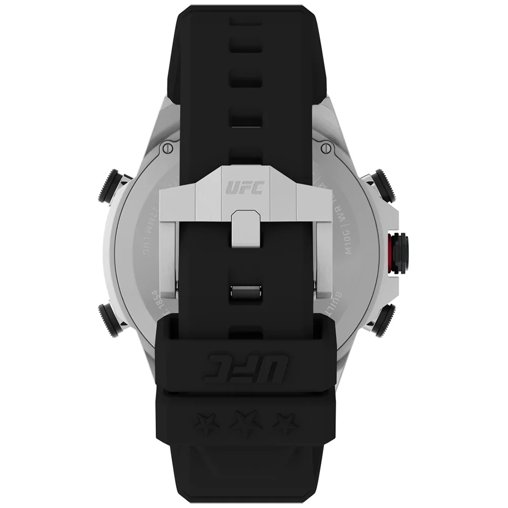 Step into the octagon with the UFC Kick Digital. This timepiece packs a punch with its substantial 49mm stainless-steel case and bezel, along with a rugged black silicone strap that’s built to last. Featuring an octagonal sub-dial with alarm, split, chronograph, and AM/PM feature indicators, it?s perfect for keeping track of time whether it?s a?training or rest day. This watch is?also built with a countdown timer for timing workouts and ensuring optimal performance. Plus, it has an INDIGLO? backlight and 100m of water resistance, making it the perfect matchup no matter the time or the place.