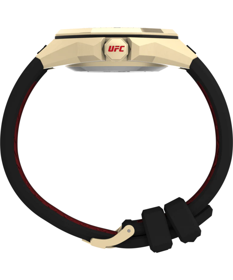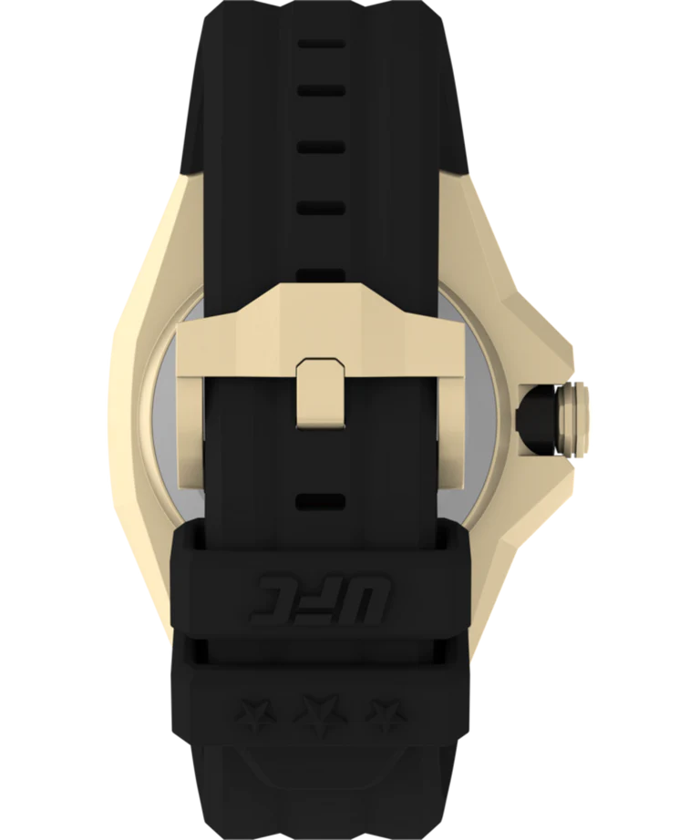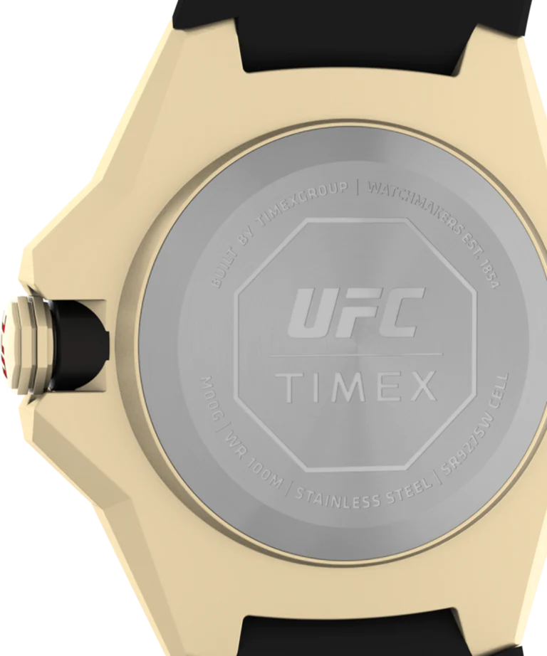 Showcasing hard lines and sleek architectural design, the TIMEX UFC Pro is a premium analog statement piece for any wrist. This watch reps our authenticity with pride, from the line-embossed UFC logo on the gold-tone dial and comfortable black band, to the expert construction of the octagonal bezel and enamel-inlayed crown. A date indicator sits within the textured multi-layered dial, while its gold-tone stainless-steel case weighs in at a substantial 44mm and 100m of water resistance for rugged durability.