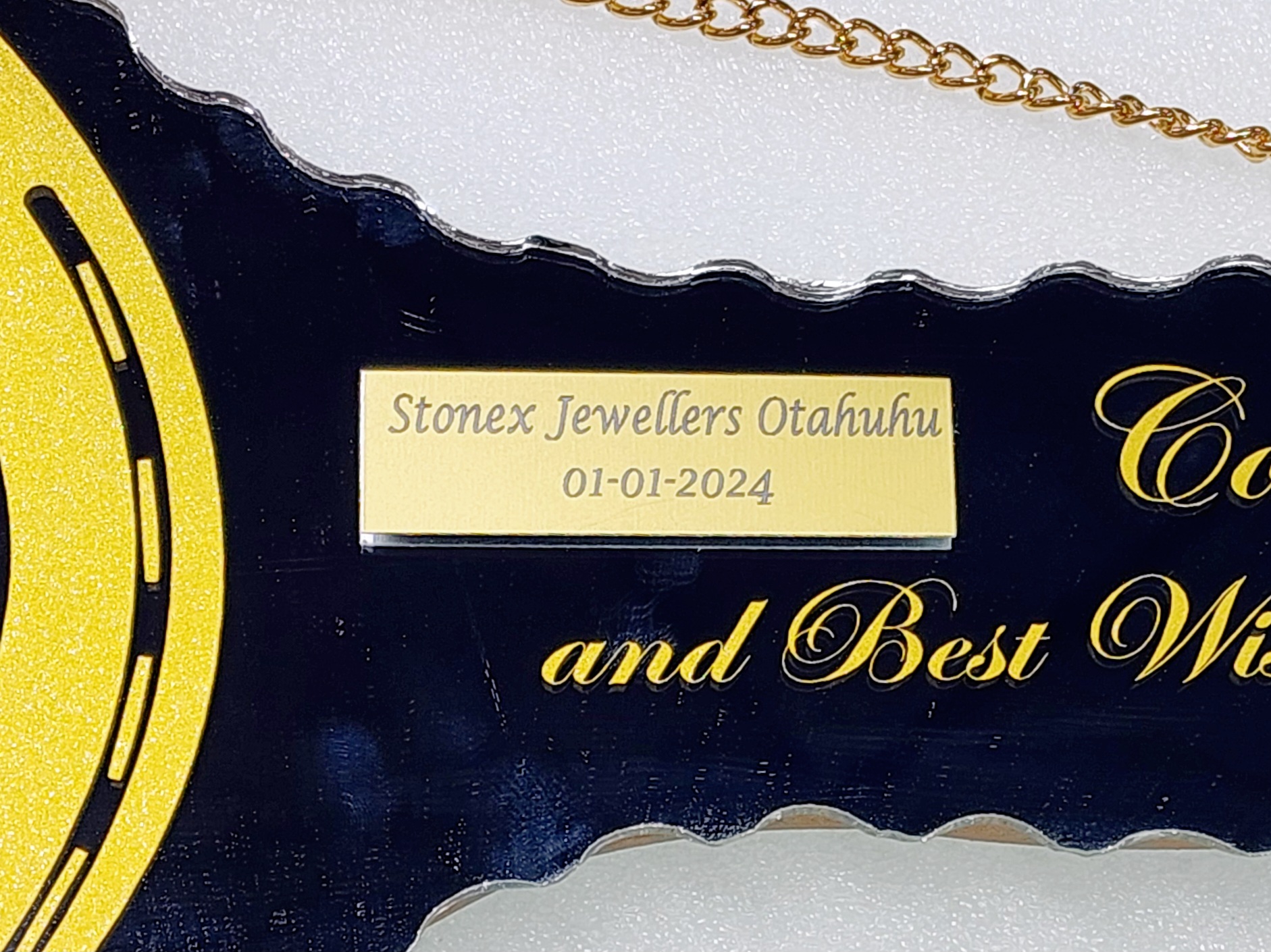 For extra $30.00 we are able to place on the glass key a gold plaque (70mm x 20mm) with person’s name and date of birth if required.
