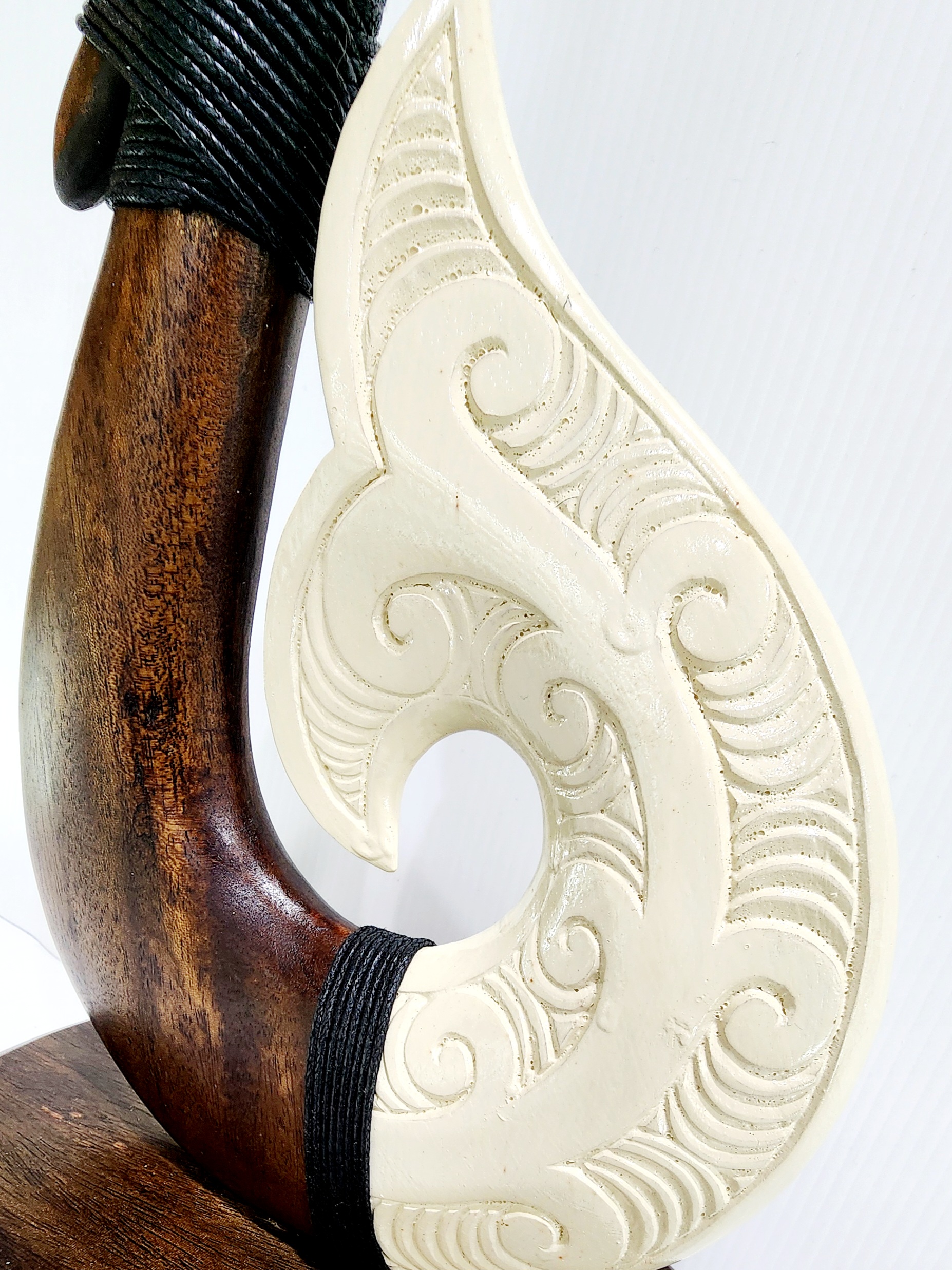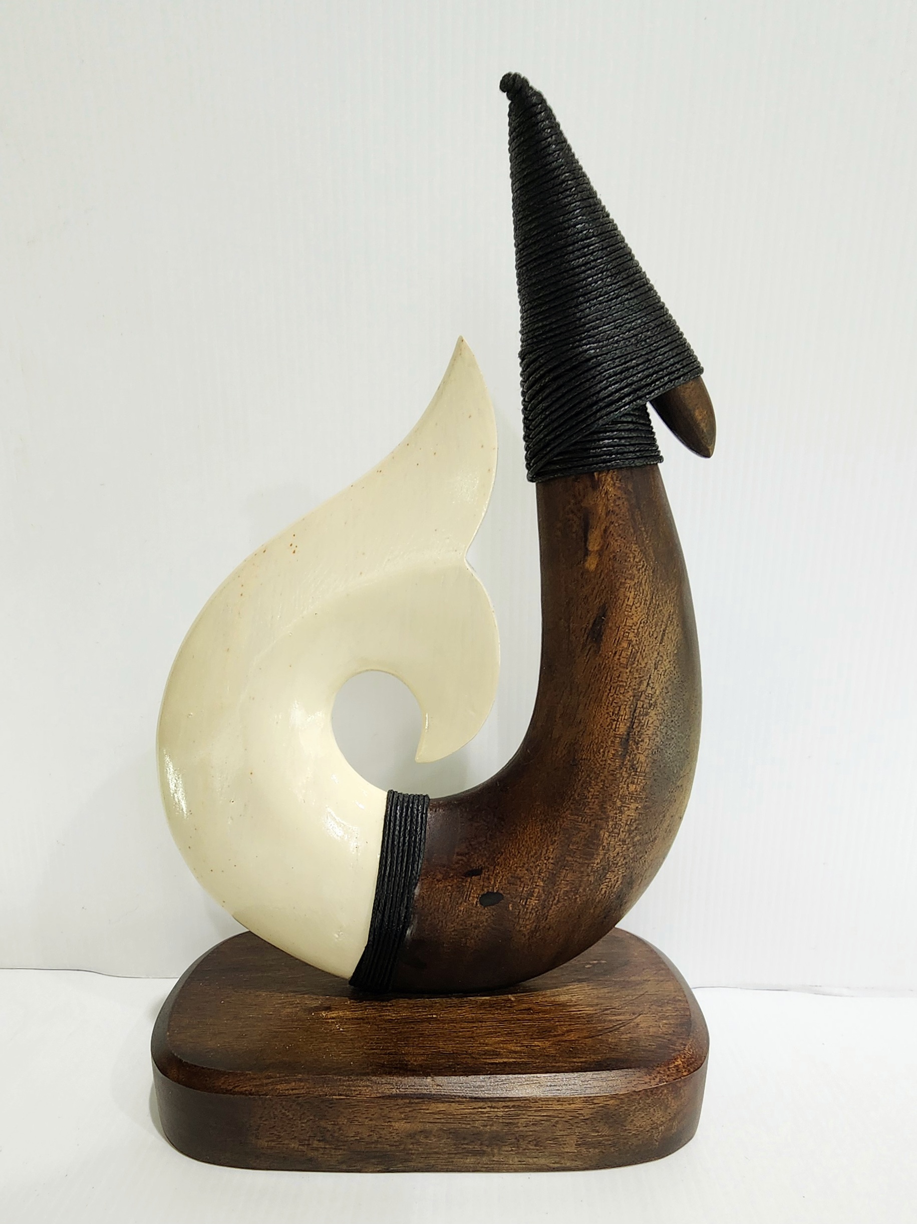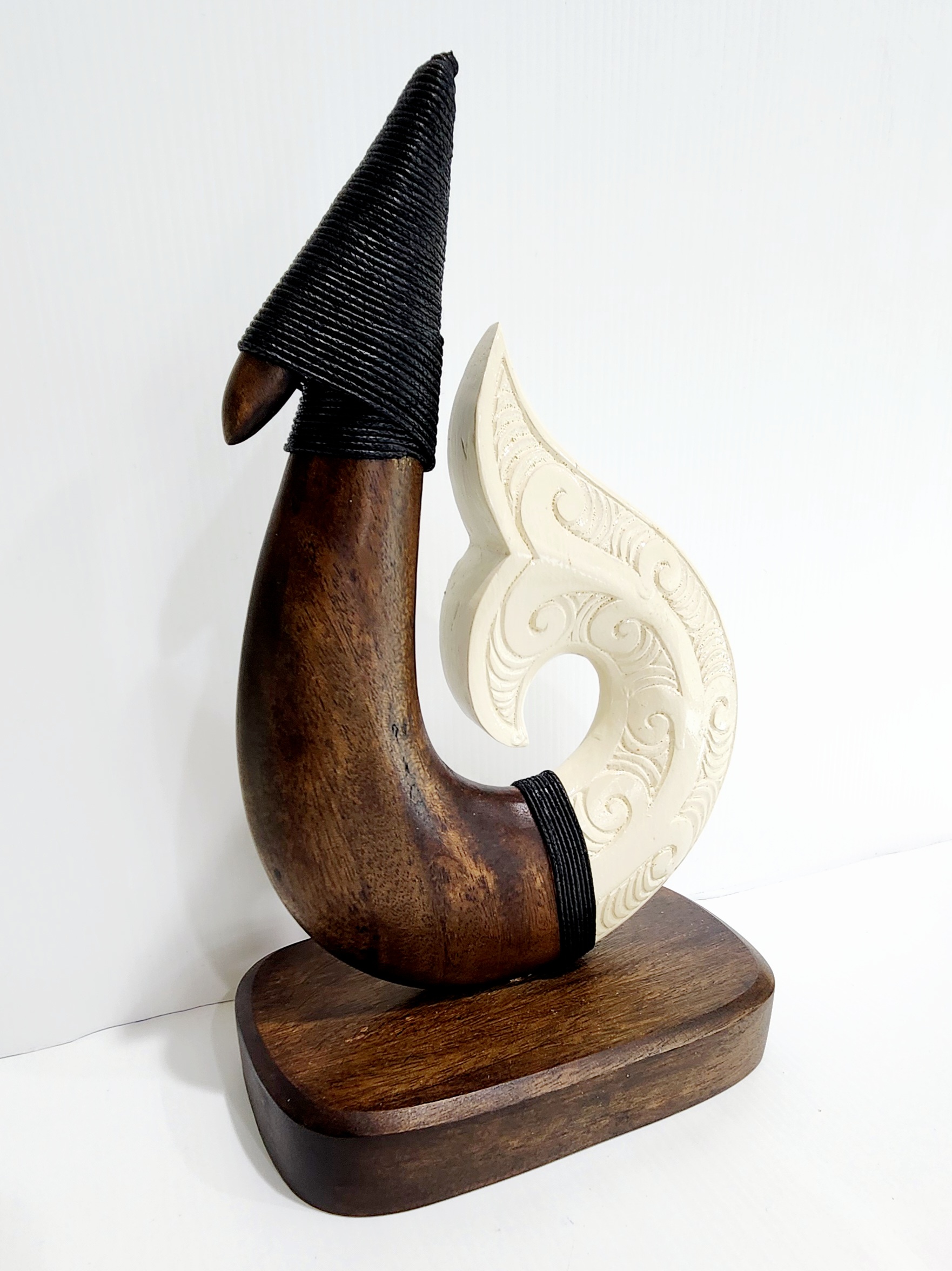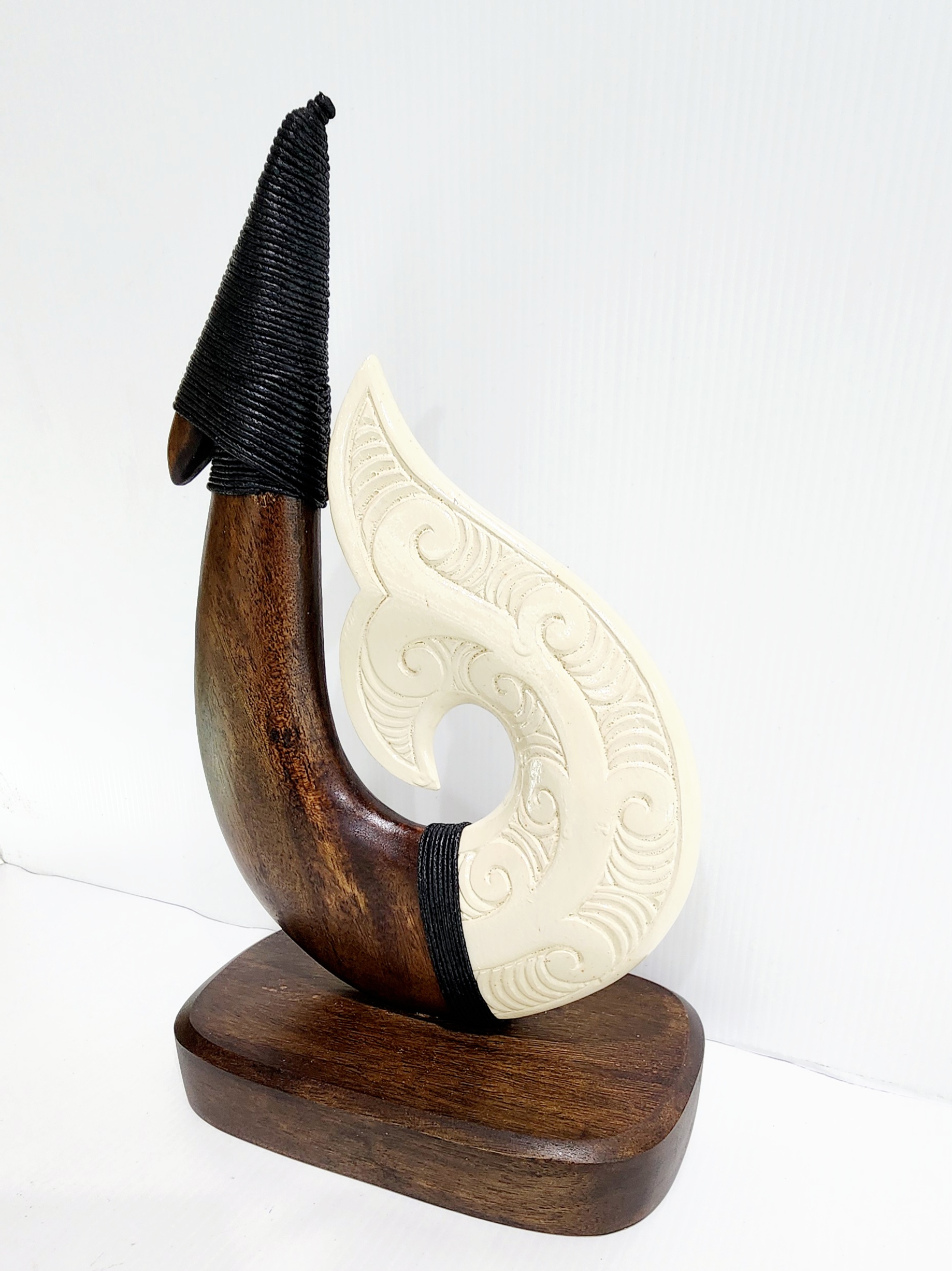This exquisite Fish Hook on Stand is meticulously carved from New Zealand Rimu Wood, making it an exceptional presentation piece, trophy, or keepsake. It serves as a meaningful souvenir of New Zealand and offers a unique alternative to the traditional 21st key. The front of the Hook is adorned with intricately carved patterns, showcasing the craftsmanship and cultural significance of the design with white finish resin for that stunning decorative piece you can display, while the back remains plain, highlighting the natural beauty of the wood. This piece is a perfect blend of artistry and tradition, ideal for commemorating special occasions.